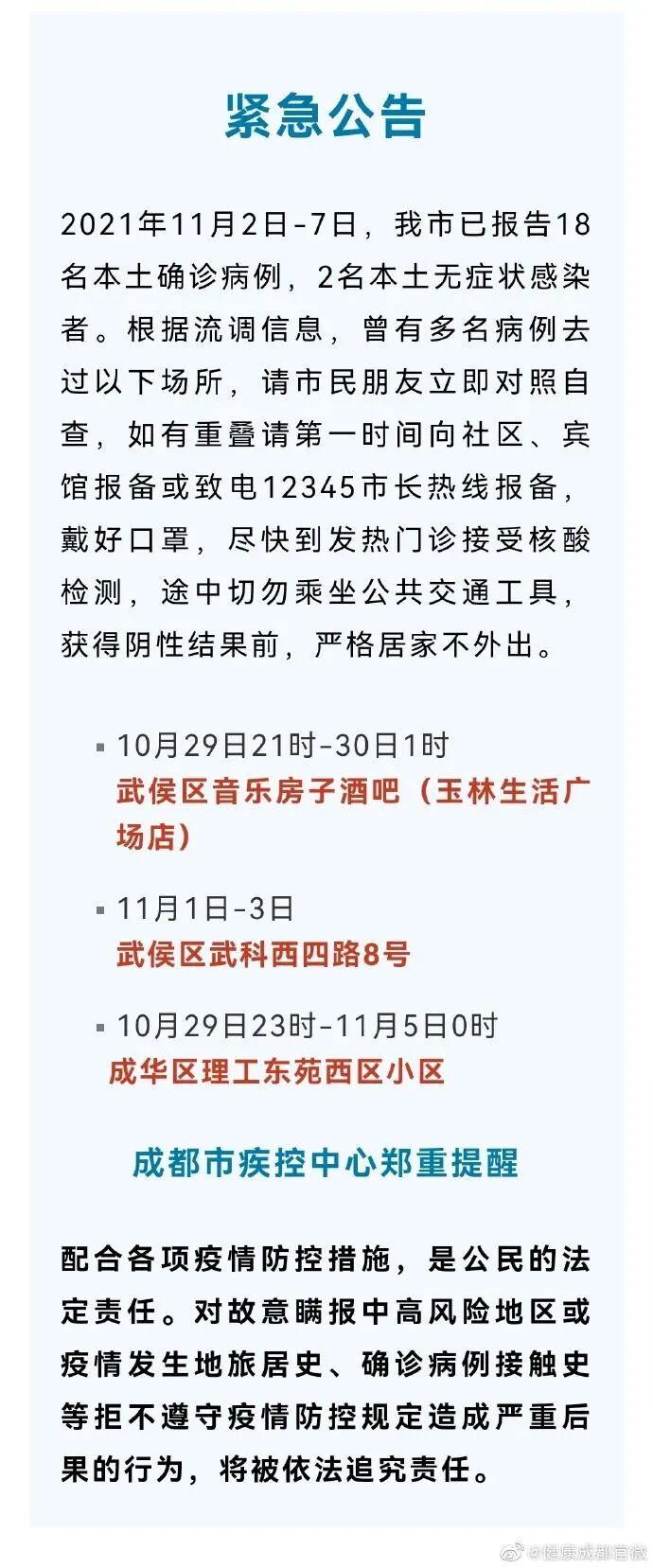 本土4例:2例为11月6日本土无症状感染者转确诊;1例,女,63岁,系成都市通报确诊病例6的同楼栋邻居,11月5日其居住小区纳入封控,11月7日确诊;1例,男,35岁,系成都市通报确诊病例6的同事,11月5日作为密切接触者纳入集中隔离,11月7日确诊。